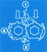 兩個(gè)反向旋轉(zhuǎn)的軸致使顆粒物在雙軸間被粉碎;